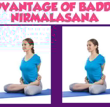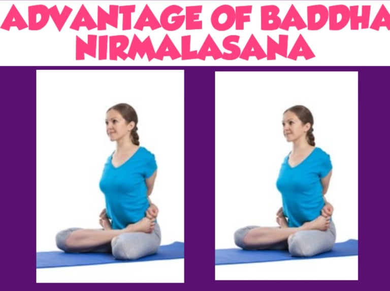 Baddha Nirmalasana (Bound Easy Pose) is a seated yoga posture that offers a range of benefits for the body, mind, and spirit. This pose is a variation of Padmasana (Lotus Pose) and involves the hands being bound behind the back, which helps open the chest, shoulders, and hips. It is an excellent pose for promoting flexibility, mental focus, relaxation, and emotional balance. Below are the key advantages of practicing Baddha Nirmalasana regularly: 1. Improves Flexibility: One of the major benefits of Baddha Nirmalasana is the improvement in flexibility, especially in the hips, groin, and lower back. When the feet are placed on opposite thighs in a cross-legged position, it stretches the inner thighs, groin muscles, and hip flexors. The added binding of the hands behind the back also contributes to an opening of the chest and shoulders. Regular practice of this pose can help release tightness in the hips and increase mobility, which is beneficial for yoga practitioners and individuals experiencing stiffness from prolonged sitting. 2. Opens the Chest and Shoulders: In Baddha Nirmalasana, the hands are clasped behind the back, which naturally opens the chest and draws the shoulders back. This action counteracts the effects of poor posture, which often results from sitting at desks or looking down at screens. The chest opening helps to stretch the pectoral muscles, relieve tension in the upper back and shoulders, and improve lung capacity by allowing for deeper breaths. This opening of the chest can also support better alignment in other yoga postures, contributing to more effective breathing and greater overall flexibility. 3. Enhances Posture: Practicing Baddha Nirmalasana regularly strengthens the muscles responsible for maintaining an upright posture. The effort of keeping the spine long and straight in this seated position encourages awareness of alignment. This is particularly beneficial for individuals who experience slouching or poor posture due to sedentary lifestyles. Engaging the core muscles and ensuring that the spine remains aligned helps to create a more balanced and natural posture. . Over time, the muscles that support the spine become stronger, reducing the likelihood of back pain and other postural issues. 4. Relieves Tension and Stress: The practice of Baddha Nirmalasana is also calming for the nervous system. The chest opening and deep breathing encourage relaxation and help activate the parasympathetic nervous system, which is responsible for the body’s “rest and digest” functions. This can help reduce the levels of stress hormones like cortisol, promoting a sense of calm and emotional well-being. Additionally, the focus required to hold the pose helps shift attention away from external distractions, fostering a meditative state that encourages mental clarity and peace. 5. Improves Circulation: Since Baddha Nirmalasana involves a seated position with a focus on maintaining an upright spine and mindful breathing, it helps improve blood circulation throughout the body. The opening of the chest and shoulders increases the flow of oxygenated blood to the upper body, particularly the heart, lungs, and brain. The stretching of the legs and hip muscles can also help stimulate blood flow to the lower body, promoting overall circulation and preventing issues like swelling or stiffness in the legs and feet. 6. Promotes Hip Health: The leg position in Baddha Nirmalasana—where the feet are placed on the opposite thighs—gently stretches and strengthens the hip flexors, groin, and pelvic muscles. Regular practice helps increase flexibility and mobility in the hip joints. This is particularly beneficial for individuals who have tight hips due to sedentary habits or activities like running and cycling. Improved hip flexibility can alleviate discomfort in the lower back and pelvis and can also reduce the risk of injury in other physical activities. 7. Encourages Mindfulness and Focus: Baddha Nirmalasana requires concentration and focus to maintain balance, alignment, and breathing. The pose cultivates mindfulness by encouraging practitioners to become aware of their body and breath in the present moment. This focus helps reduce mental clutter and distractions, allowing practitioners to develop greater mental clarity and emotional stability. The mental calm that comes from holding this pose also extends to other areas of life, helping to reduce anxiety and improve focus and productivity. 8. Stretches and Strengthens the Spine: The practice of sitting upright in Baddha Nirmalasana strengthens the muscles along the spine, helping to improve spinal alignment. The act of engaging the core to maintain balance provides gentle support to the spine, while the chest-opening motion allows for deeper breathing and encourages a natural curve in the lower back. Over time, regular practice can improve spinal health, flexibility, and stability, and can help reduce discomfort associated with misalignment or muscle tension in the back. 9. Stimulates the Digestive System: Sitting in this bound position has a mild compressive effect on the abdominal organs, which can aid digestion. The posture helps to massage the internal organs, stimulating digestion and promoting the movement of energy (prana) through the digestive system. This can be particularly beneficial for people who suffer from digestive issues like constipation or bloating. The deep, steady breathing that accompanies the pose also supports the optimal functioning of the diaphragm and abdominal muscles, contributing to better overall digestion. 10. Balances the Mind and Emotions: Baddha Nirmalasana helps balance the mind and emotions by fostering a sense of grounding and relaxation. The chest-opening action encourages emotional release and helps alleviate feelings of emotional heaviness or tightness in the chest. The physical stretch in the pose also stimulates the energy centers (chakras), especially the heart chakra (Anahata) and the r
