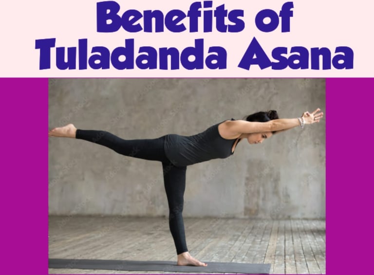 Tuladandasana, or the Balance Posture with a Staff, is an advanced yoga pose that includes balancing on one leg while holding the other leg on a level plane in front of the body, with both arms expanded straight out to hold a staff or comparable prop. This posture is regularly compared to the conventional "Warrior III" or "Warrior Balance" posture but with included complexity and adjust challenges. Whereas physically requesting, Tuladandasana offers an assortment of benefits for the body, intellect, and in general well-being. Here's a closer see at its various advantages: 1. Moves forward Adjust and Coordination: One of the essential benefits of Tuladandasana is its capacity to improve adjust and coordination. The posture requires the specialist to adjust on one leg whereas keeping up a straight, amplified body. As such, it fortifies the muscles dependable for solidness, particularly in the lower leg, knee, and hip joints of the standing leg. This progresses the body’s proprioception, or mindfulness of its position in space. Normal hone of this pose can lead to way better in general adjust, which is significant for everyday exercises and other physical exercises. The posture too makes a difference create coordination between diverse body parts. Keeping up the flat position of the extended leg whereas balancing on one leg challenges the professional to synchronize developments and actuate different muscle bunches simultaneously. 2. Reinforces Center Muscles: Tuladandasana essentially reinforces the center muscles. Holding the amplified leg and keeping up adjust requires engagement of the stomach muscles, counting the rectus abdominis, obliques, and transverse abdominis. These center muscles stabilize the body and keep the middle adjusted as the leg is expanded. A solid center is basic for great pose, soundness, and by and large quality, and Tuladandasana works to reinforce this vital area. The posture makes a difference make strides in general pose as a result of the center engagement. It moreover upgrades muscle perseverance and contributes to the advancement of a conditioned and steady midsection, which can help in the avoidance of lower back pain. 3. Improves Leg Quality and Flexibility: Tuladandasana is profoundly successful in reinforcing the muscles of the legs, especially the quadriceps, hamstrings, calves, and glutes. The standing leg must support the whole weight of the body, leading to a strengthening of the leg muscles. As the extended leg is held parallel to the floor, the hip flexors, glutes, and hamstrings are extended and engaged. Regular practice of this posture builds muscular continuance and quality in the lower body, advancing superior execution in exercises such as strolling, running, and other sports. The adaptability in the amplified leg also moves forward over time, contributing to superior joint versatility and diminishing the risk of muscle tightness and damage. 4. Improves Posture: The engagement of the core and the alignment of the spine during Tuladandasana contribute significantly to improving posture. To perform the pose correctly, the practitioner must keep the back straight, the chest open, and the shoulders aligned. This promotes a natural spinal alignment and encourages awareness of posture. Regular practice can help counteract the effects of poor posture, particularly from prolonged sitting, by strengthening the muscles that support the spine and improving the balance between the upper and lower body. Additionally, Tuladandasana opens the chest and stretches the shoulders, which can relieve the tension often caused by slumping or hunching over. 5. Increases Mental Focus and Concentration: Tuladandasana requires intense concentration and mental focus to maintain balance and correct form. As the body balances on one leg with the other extended, the mind must stay focused on controlling the body’s movements, maintaining stability, and managing breath. This level of concentration enhances mental clarity and sharpness, helping to improve cognitive function. The practice of holding a challenging pose also cultivates mindfulness, encouraging the practitioner to stay present at the moment and focus on the breath and body. This focus has a calming effect on the nervous system, reducing stress and enhancing mental clarity. 6. Strengthens the Lower Back: While Tuladandasana primarily targets the legs and core, it also helps to strengthen the muscles of the lower back. The act of keeping the spine straight and balanced while holding the extended leg engages the muscles along the back, including the erector spinae. Strengthening these muscles is essential for preventing lower back pain and improving posture. Over time, regular practice of this asana can help build a strong, resilient back, reducing the risk of injuries related to weak or tight back muscles. 7. Stretches and Opens the Hips: The extended leg in Tuladandasana stretches the hip flexors, which can become tight from sitting for extended periods or from lack of movement. By holding the leg out in front of the body, the hip flexors are lengthened, promoting flexibility and improved joint mobility. This can be particularly helpful for individuals who spend a lot of time sitting and experience stiffness or tightness in the hips. In addition, the balancing action of the pose encourages external rotation of the hip joint, which helps increase the range of motion and flexibility in the hips. This is important for overall mobility and reduces the risk of hip injuries. 8. Enhances Breathing Control: As with numerous yoga postures, Tuladandasana empowers profound, controlled breathing. Keeping up adjust and focus whereas holding the expanded leg requires mindfulness in the breath, making a difference to calm the apprehensive framework. The hone of moderate, unfaltering inward breaths and exhalations energizes diaphragmatic breathing, which makes strides lung capacity and oxygen stream all through the body. The c
