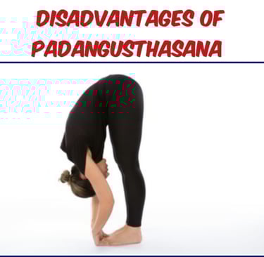While Padangusthasana (Big Toe Pose) offers numerous benefits for flexibility, strength, and overall well-being, it is important to be aware of certain disadvantages or challenges that might arise during its practice, particularly for individuals with specific health conditions or limitations. These potential disadvantages, when recognized and addressed, can help ensure that the practice remains safe and effective. Below are some of the main drawbacks or considerations of Padangusthasana: 1. Strain on the Lower Back: One of the main disadvantages of Padangusthasana is the potential strain it can place on the lower back, especially for beginners or those with pre-existing back issues. As the pose requires a forward fold, individuals who have tight hamstrings or limited flexibility might compensate by rounding their backs, which can lead to discomfort or even injury. Over time, this can result in muscle tension, misalignment, or irritation of the lower back. It’s important to focus on maintaining a long spine, engaging the core, and avoiding excessive rounding of the back when practicing the pose. 2. Knee Discomfort: Individuals with tight hamstrings or limited flexibility in the legs might experience discomfort in the knees during Padangusthasana. If the legs are not fully stretched and the knees are locked or hyperextended, the stress placed on the knee joints can lead to strain. In particular, individuals with a history of knee injuries, such as ligament damage or arthritis, should approach this pose with caution. It may be necessary to keep a slight bend in the knees to protect the joints and avoid overstretching. 3. Neck Tension: In Padangusthasana, the head hangs down as the torso folds forward, which can lead to tension in the neck, especially if the head is not properly aligned with the spine. For people who have neck issues or cervical spine problems, the position may exacerbate existing discomfort. Holding the head too low or letting it hang loosely can strain the neck muscles, potentially leading to stiffness or pain. To avoid this, it’s crucial to ensure that the neck remains neutral and in line with the spine, with the crown of the head reaching toward the floor without collapsing the neck. 4. Potential for Overstretching: Because Padangusthasana involves a deep stretch of the hamstrings and lower back, individuals who are not sufficiently warmed up or have tight muscles may risk overstretching. Overstretching occurs when the muscles are pushed beyond their normal range of motion, which can cause micro-tears in the muscle fibers, leading to pain and injury. It is especially important for beginners to approach this pose gently, using props like yoga straps to assist with reaching the toes if needed, and to avoid forcing the body too far into the stretch. 5. Contraindications for Certain Health Conditions: Padangusthasana may not be suitable for individuals with specific health conditions, such as severe lower back issues, sciatica, or herniated discs. Those with these conditions should avoid deep forward bending poses that can aggravate nerve compression or strain the spine. Individuals with severe hamstring tightness or hip flexibility issues may also find the pose challenging and could risk injury if not practiced with caution. Pregnant women should avoid deep forward bends that compress the abdomen, as they can be uncomfortable or unsafe. 6. Risk of Falling: While Padangusthasana is typically practiced while standing, maintaining balance during the pose can be difficult for some individuals, particularly if they lack strength or stability in the legs or core. In the forward fold, it’s easy to lose balance, especially if the legs are not engaged or if there is any tension in the body. Losing balance in a standing forward bend can lead to a fall or injury, particularly in crowded classes or spaces with limited room. To avoid this risk, ensure proper alignment and engage the legs to maintain stability. 7. Difficulty in Reaching the Toes: For many practitioners, one of the biggest challenges in Padangusthasana is being able to reach the toes, particularly for those with tight hamstrings or limited flexibility in the legs. This can lead to frustration or discouragement, as many might feel they are not achieving the full expression of the pose. However, the goal should not be to reach the toes but to maintain proper alignment and form. Using a yoga strap around the feet or simply resting the hands on the shins or ankles is an acceptable modification. Forcing the body to reach the toes before the muscles are ready can lead to overstretching or injury. 8. Possible Impact on Breathing: In deep forward bends like Padangusthasana, some individuals may find it challenging to maintain deep, even breathing due to the compression in the abdominal region. This can create a feeling of constriction in the chest or diaphragm, making it harder to maintain calm and steady breathing. Difficulty in breathing may limit the effectiveness of the pose, especially for practitioners who rely on their breath to guide them through the stretch. It is important to focus on breath awareness and avoid holding the breath or forcing the body into a position that feels restrictive. 9. Not Suitable for Beginners Without Proper Guidance: Padangusthasana requires a certain level of flexibility, balance, and awareness of the body. For beginners who are unfamiliar with yoga or have limited flexibility, attempting this pose without proper guidance can result in strain or injury. It’s crucial for beginners to practice under the supervision of a qualified yoga instructor who can provide modifications, ensure proper alignment, and prevent any risk of injury. Conclusion: While Padangusthasana offers many benefits, including improved flexibility, better posture, and reduced stress, it is important to approach this pose with mindfulness and awareness. The disadvantages—such as strain on the lower back, knee discom