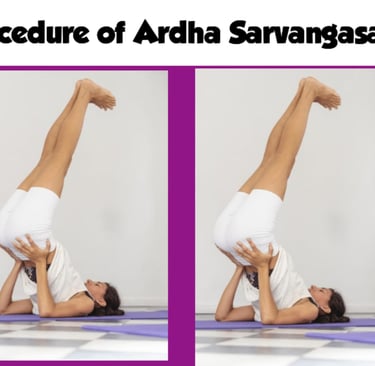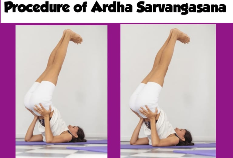 Method of Ardha Sarbangasana Ardha Sarvangasana (Half Bear Stand) is a principal yoga posture that includes adjusting on the shoulders with the legs raised. It is a preliminary posture for the full bear stand (Sarvangasana) and is incredible for tenderfoots to hone some time recently progressing to more seriously reversals. The pose can progress circulation, fortify the upper body, and calm the intellect. Underneath is a point by point direct on how to perform Ardha Sarvangasana securely and effectively. Preparation 1. Discover a Calm Space: Select a calm and comfortable space where you can lie down on a yoga tangle or any delicate surface. 2. Wear Comfortable Clothing: Guarantee you wear clothing that does not limit development, as this will offer assistance you move openly amid the practice. 3. Warm-Up: Some time recently beginning Ardha Sarvangasana, it’s critical to warm up the body. Perform a few delicate extends and postures like Cat-Cow extends, Forward Overlap, or Descending Canine to discharge pressure and get ready the muscles for the pose. Steps to Perform Ardha Sarvangasana 1. Lie Down on Your Back: Start by lying level on your back on the tangle with your legs amplified straight and arms resting at your sides, palms confronting down. Make beyond any doubt your body is loose and adjusted, with your neck and spine in an unbiased position. 2. Lock in the Center: Delicately lock in your center muscles by pulling your navel toward your spine. This actuation will offer assistance stabilize your middle and keep up control amid the posture. 3. Lift the Legs: Breathe in profoundly and gradually raise both legs towards the ceiling. Keep them straight and together as you lift them, guaranteeing that the development is moderate and controlled. Your legs ought to be opposite to the floor. 4. Back the Lower Back: As your legs are raised, put your hands on your lower back for back. Your elbows ought to stay on the floor, and your upper arms ought to press down solidly to keep up steadiness. The fingers ought to back your back, making a difference to keep the spine straight and avoiding any strain. 5. Lift the Pelvis: On a breath in, delicately lift your pelvis off the floor by pushing with your legs and locks in your center. The weight of your body ought to be resting on your shoulders, with your neck and head remaining gently on the floor. The upper back ought to be immovably on the ground, and the chest ought to be moving towards the chin. 6. Fix the Spine: Once your pelvis is lifted, make beyond any doubt the spine is adjusted, and the legs are straight. The middle and legs ought to shape a straight line from your shoulders to your feet. You may feel a slight prolongation of the spine as you adjust in this position. 7. Hold the Position: Keep the body dynamic by locks in the legs and center muscles. Keep up this position for 20 to 30 seconds, breathing profoundly and consistently. Keep your look centered on the ceiling or near your eyes for more profound concentration. Guarantee that there is no strain on the neck, and that the weight is equitably conveyed on the shoulders. 8. Discharge the Posture: To exit the posture, gradually lower your legs back down to the floor whereas keeping control of the development. Delicately roll your spine back onto the tangle and bring your legs to the floor. Rest for a moment with your legs extended and arms at your sides. 9. Rest and Recover: After performing Ardha Sarvangasana, it's critical to deliver your body time to unwind and recoup. You can rest in Savasana (Carcass Posture) for a few minutes to offer assistance the body return to its common state. Tips for Secure Practice Neck and Spine Arrangement: All through the posture, make beyond any doubt that your neck is in an impartial position, and your spine is straight. Dodge any compression or strain on the neck by guaranteeing that the weight is on the shoulders, not the neck. Do Not Overexert: If you are unused to the posture or have constrained adaptability or quality, begin with shorter holds and slowly construct up your stamina over time. Breathing: Keep up moderate, profound breaths whereas in the posture. Breathe profoundly into the paunch to offer assistance back your center and keep your body relaxed. Modifications: If you discover it troublesome to lift the legs or hold the posture, you can hone the posture with a prop like a square or support put beneath the hips for additional bolster. Then again, you can keep your legs somewhat bowed if fixing them completely feels as well challenging. Avoid if You Have Certain Conditions: If you have neck, back, or bear wounds, it is prescribed to maintain a strategic distance from this posture or hone it beneath the direction of a qualified educator. Moreover, if you have tall blood weight, heart conditions, or eye issues (like glaucoma), counsel a healthcare supplier some time recently endeavoring this pose. Conclusion Ardha Sarvangasana is an available and compelling yoga posture that offers an extent of physical and mental benefits. By taking after the steps over and practicing frequently, you can fortify your body, make strides pose, and accomplish more noteworthy mental clarity and calmness. Continuously be careful of your body’s limits and perform the posture with legitimate arrangement to dodge harm. With time and consistency, you can securely coordinate Ardha Sarvangasana into your yoga hone for made strides wellbeing and well-being.