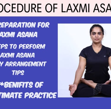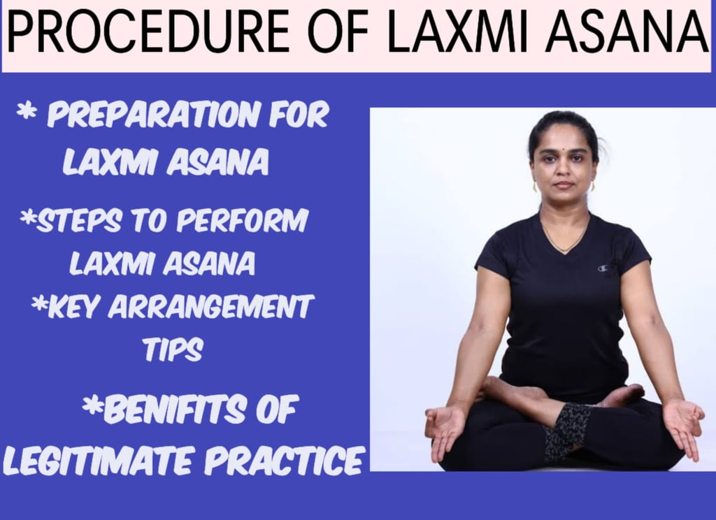 Blog post descriLakshmi Asana, also known as the Goddess posture is an effective yoga pose that symbolizes quality, establishing and plenitude. It can be practiced powerfully as a standing squat-like posture or statically as a situated thoughtful pose. Underneath is a nitty-gritty step-by-step direct to practicing Lakshmi Asana, taken after by tips for arrangement and safety. Preparation for Lakshmi Asana 1. Choose a calm space: Discover a calm, clean range to hone. Utilize a yoga tangle for consolation and stability. 2. Warm up: Perform light extends, particularly for the hips, thighs and lower legs, as this posture requires adaptability and quality in these areas. Steps to perform Lakshmi Asana (Standing Version) 1. Begin in Ramayana (Mountain Pose) :• Stand tall with feet together or somewhat apart. • Keep your spine straight, arms loose by your sides, and shoulders rolled back. • Distribute your weight equitably on both feet. 2. Move to Tree Posture Foundation: • Shift your weight onto your cleared out leg, keeping it solid and stable. • Lift your right foot and put it on your cleared out internal thigh (or calf if adjust is a challenge). Dodge putting it on the knee joint. 3. Connect Your Hands in Anjali Audra: • Bring your palms together in front of your chest in a supplication position (Anjali Audra). 4. Extend Arms Upwards (Optional): • For a more energetic adaptation, expand your arms overhead, keeping the palms together or somewhat apart. • Stretch your fingers towards the sky for a typical "coming to toward abundance." 5. Adjust and Visualize: • Focus on a settled point at eye level ( Kristi) to offer assistance keep up balance. • Visualize the vitality of Goddess Lakshmi streaming through you, bringing concordance and prosperity. 6. Switch Legs: • Slowly discharge your right foot and return to Tad Asana. • Repeat the same steps on the inverse side, adjusting on your right leg. 7. Conclude with Gratitude: Once completed on both sides, stand still in Tad Asana for a few minutes. Reflect on the qualities of Lakshmi you wish to embody. Steps to perform Lakshmi Asana (Situated Form) 1. Sit Comfortably on the Ground: Start in a cross-legged position, sitting or a pad or tangle to guarantee your hips are somewhat hoisted over your knees. 2. Align Your Body: Keep your spine tall, shoulders unwinds, and chin marginally tucked your back ought to be straight but not rigid. 3. Hand Situation: (i) Rest your hands on your knees, palms confronting upwards in a getting signal. (ii) Then again, from a Audra (like Dayana Audra) by putting your palms together in your lap. 4. Focus on Your Breath: Near your eyes and take moderate, profound breaths. Center on establishing yourself and visualizing wealth streaming into your life. 5. Hold the posture: Remain in this reflective position for 5–15 minutes, or longer if comfortable. Key Arrangement Tips • Engage Your Center: Secure your lower back by keeping your stomach muscles locked in all through the posture. • Maintain Legitimate Knee Arrangement: In the standing form, guarantee your knees are adjusted with your toes to dodge strain. • Use Props if Required: For the situated form, utilize pads or squares to back your hips and keep up legitimate posture. • Focus on Adjust: Disseminate your weight equitably over your feet in the standing posture to anticipate instability. Benefits of Legitimate Practice • Builds quality in the thighs, hips, and core. • Improves adaptability in the crotch and internal thighs. • Enhances center and establishing amid meditation. By taking after these steps, you can securely and successfully hone Lakshmi Asana, picking up both physical and otherworldly benefits. Alter your Hone concurring to your consolation level, and over time, more profound your involvement of this capable Asana. ption.
