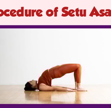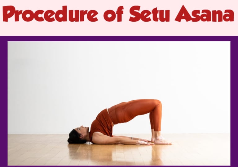 Setu Asana, or Bridge Pose, is a foundational yoga posture that offers numerous benefits, including strengthening the core, stretching the chest, and promoting spinal flexibility. It is a backbend that involves lifting the hips while keeping the feet and shoulders grounded. The pose can be performed by individuals of all experience levels, as it is both accessible and effective for building strength and improving posture. Below is a detailed step-by-step procedure for performing Setu Asana correctly. 1. Preparation and Alignment: i. Begin by lying on your back on a yoga mat with your legs extended straight and arms by your sides. ii. Relax and center yourself by taking a few deep breaths. Allow your body to settle into the ground. iii. Bend your knees and bring your feet flat to the floor, positioning them hip-width apart. Confirm your feet are parallel, with the toes pointing forward. iv. Place your arms next to your body with your palms facing down. Ensure your shoulders are relaxed and not scrunched up towards your ears. v. Align your head and neck so that they are neutral and comfortable. Avoid turning or tilting the head, keeping it in line with the spine. 2. Activating the Feet and Legs: i. Press your feet firmly into the mat. Retain your feet hip-width apart, and ensure your heels are close to your glutes. ii. Engage your leg muscles, pressing through the soles of your feet to create a stable foundation for the pose. iii. Activate your glutes by gently squeezing them, which will help in lifting the hips and ensuring stability throughout the posture. 3. Lifting the Hips: i. Inhale deeply and, on the exhale, begin to lift your hips towards the ceiling. ii. As you raise your hips, push your feet into the ground and engage your core muscles to lift the pelvis higher while maintaining a firm connection between your feet and the floor. iii. Engage the inner thighs to prevent your knees from splaying outward. Retain your knees aligned above your ankles. iv. Lift your chest, aiming to create a gentle arch in your back, but avoid overextending the spine. The shoulders should remain on the mat with your arms pressing down for stability. 4. Aligning the Shoulders and Neck: i. Keep your arms firmly pressed into the floor, which will help in lifting the chest higher. If comfortable, you can interlace your fingers underneath your back for additional support. ii. Press your shoulders down into the floor while broadening across your chest. This will help open the forefront of your body. iii. Maintain a neutral neck by keeping the head relaxed on the mat. Avoid turning the head or straining the neck during the pose. 5. Creating the Arch: i. Aim to create a smooth curve from your shoulders to your knees, lifting the hips as high as you can while maintaining balance and stability. ii. Use the muscles of your legs and glutes to keep the hips lifted, and avoid letting your lower back sag. iii. If you can, try to roll your shoulders slightly underneath your back to deepen the chest opening. 6. Breathing and Holding the Pose: i. Breathe deeply and evenly while holding the pose. Try to inhale and exhale through your nose, making sure not to hold your breath. ii. Hold the position for 20-30 seconds, or longer if comfortable. You can gradually increase the duration as you build strength and flexibility. iii. During this time, focus on maintaining engagement in your legs and core, and keep the chest open and broad. 7. Releasing the Pose: i. To come out of Setu Asana, inhale deeply and slowly lower your hips back down to the floor, one vertebra at a time. ii. Release your arms by bringing them back to your sides and relax the body. iii. Take a few moments to lie flat on your back and observe the effects of the pose, allowing your body to relax. 8. Modifications and Variations: i. Support your back: If you have lower back discomfort, you can place a block under your sacrum for additional support and comfort. ii. Bridge Pose with Leg Extension: Once you are comfortable with the standard pose, you can extend one leg at a time, keeping it lifted while maintaining the bridge posture, to further challenge your balance and strength. Tips for Safe Practice: Avoid overextending the back: The key to the Bridge Pose is finding the right balance between lifting the hips and maintaining a neutral spine. Engage your core throughout the posture to protect your lower back. Do not strain your neck: Keep your head relaxed and avoid pressing it into the mat. Conclusion: Setu Asana (Bridge Pose) is a powerful yet accessible posture in yoga that strengthens the legs, glutes, and core while offering a gentle stretch to the spine, chest, and neck. By following the proper procedure and practicing regularly, you can enjoy the many benefits of this pose, including improved posture, reduced tension, and increased flexibility. Whether you're a beginner or an experienced yogi, Setu Asana is a valuable addition to any yoga practice.