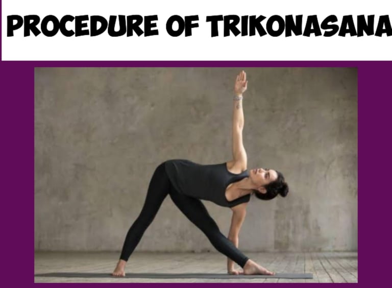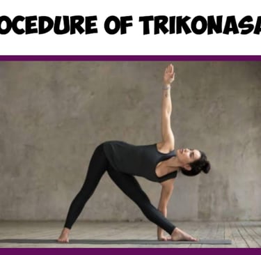 Trikonasana, or Triangle Pose, is a standing yoga posture that offers numerous benefits, such as improving flexibility, strengthening muscles, and promoting overall balance. To perform this pose correctly, it’s important to follow a detailed step-by-step procedure. Below is a comprehensive guide to executing Trikonasana: 1. Preparation: Before beginning, stand in a comfortable position with your feet together. Take a few deep breaths, center your focus, and set the intention to practice with awareness. You may also want to mentally prepare by engaging your core and focusing on grounding through your feet. 2. Step into the Wide Stance: a. Start by standing with your legs wide apart. A common distance is about 3 to 4 feet (or 1 meter), but adjust as needed based on your flexibility and comfort. b. Ensure that your feet are aligned properly: i. Your right foot should be turned outward 90 degrees, while your left foot should be angled slightly inward (around 15 degrees). ii. Both feet should stay firmly planted on the ground. The weight should be equally distributed across both feet. 3. Align the Hips and Shoulders: i. Square your hips forward so that they face the same direction as your right foot. This may take some adjustment, as the tendency is to rotate the hips to the side. ii. Open your chest, and ensure that your shoulders are stacked directly over your hips. 4. Extend Your Arms: i. As you inhale, extend your arms out to the sides at shoulder height, keeping them parallel to the floor. ii. Your palms should be facing down, and the arms should be strong and active, engaging the shoulder blades. iii. Maintain length in the arms and keep them in line with your shoulders. 5. Reach and Extend: i. Begin by reaching your right arm toward the right side as far as you can, keeping both arms extended straight. ii. Your torso should gently tilt to the right, and as you move, make sure you’re not collapsing your upper body forward. iii. Maintain a long, straight line from the tips of your fingers on the right hand to the left hand. 6. Lower Your Right Hand: i. Once you have extended your body as far as you can to the right, slowly lower your right hand to your right ankle, shin, or the floor. Keep your right arm extended and your body lengthened. ii. If your right hand doesn’t reach the floor, it’s perfectly fine to place it on a block or on your leg (shins or ankle), as long as there is no strain. iii. The left arm should now be pointing upward toward the ceiling. Keep both arms active, with your fingers extended toward the sky. 7. Open the Chest: i. Rotate your chest and torso toward the ceiling, ensuring that your ribs and hips are open and facing upward. Your gaze can follow your left hand, or you may choose to look straight ahead, depending on your neck's comfort. ii. Keep the chest open and avoid rounding your back. Engage the core muscles for stability. 8. Hold the Pose: i. Stay in the pose for about 30 seconds to 1 minute, breathing deeply and evenly. Focus on maintaining alignment, stability, and the stretch. ii. Ensure that the legs are strong and active, with the left leg engaged and the right leg straight. 9. Come Out of the Pose: i. To come out of the pose, inhale and press into your feet as you slowly rise back to an upright position. ii. Lower your left arm and return to the standing position with your feet together. iii. Take a moment to center yourself with deep, grounding breaths before transitioning to the opposite side. 10. Repeat on the Other Side: After completing the first side, repeat the pose on the opposite side. Turn your left foot outward 90 degrees, align your hips, and repeat the steps for the left side of your body. Tips for Correct Alignment and Safety: i. Avoid Collapsing the Chest: Keep your chest open and avoid collapsing your upper body forward, as this can strain the lower back. ii. Focus on Lengthening the Spine: Keep your spine long as you move into the pose, and avoid compressing the sides of your torso. iii. Use Props if Needed: If you have difficulty reaching the floor, use yoga blocks or place your hand on your shin or ankle to prevent overstretching. iv. Mind the Knees: Keep your knee caps facing forward (don’t let them hyperextend or rotate inward), and keep both legs strong. Modifications: i. Beginners: If you struggle with flexibility, use a block under your hand or place your hand on your shin, not the floor. ii. Advanced: For more depth, you can place your lower hand on the floor and extend the top arm straight upward, or even challenge your balance by looking at your raised hand. Conclusion: Trikonasana is a powerful pose that builds strength, enhances flexibility, and improves balance. By following these step-by-step instructions and maintaining mindfulness throughout, you can practice Triangle Pose safely and effectively, gaining both physical and mental benefits.