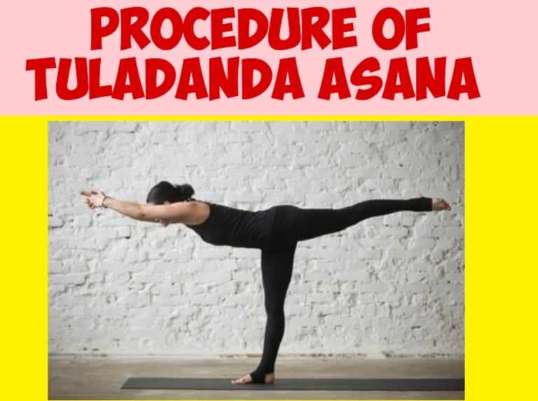 Tuladandasana, or Balance Posture with a Staff, is a challenging yet rewarding yoga pose that includes balancing on one leg whereas holding the other leg evenly in front of the body. This asana requires center, strength, and stability, engaging different muscle bunches all through the body. Here's a step-by-step direct on how to perform Tuladandasana: Step-by-Step Method for Tuladandasana 1. Start in Tadasana (Mountain Posture) Start by standing tall in Tadasana, with your feet hip-width separated, arms by your sides, and the weight of your body equitably disseminated on both legs. Stand tall with a straight spine and your chest lifted. Take a few profound breaths to center yourself and bring your focus to the display moment. 2. Shift Your Weight to One Leg From Tadasana, delicately move your weight onto your right leg. Press the right foot immovably into the floor, locks in your leg muscles and actuating the center to keep up steadiness. The cleared out leg should stay free and lifted as you get ready to expand it. 3. Lift the Cleared out Leg Gradually and consistently, start to lift your cleared out leg off the ground, keeping the knee straight. Bring the cleared out leg in front of you and raise it to a level parallel to the floor or higher if your adaptability permits. Center on keeping the pelvis adjusted and the standing leg straight and firm. 4. Expand the Arms Once the cleared out leg is lifted, expand your arms out in front of you or to the sides for way better balance. Keep the arms parallel to the floor with the palms confronting down or forward. The amplified arms will offer assistance you keep up adjust by keeping your torso aligned with the expanded leg. 5. Engage the Core and Spine Engage your core muscles, including the abdominal and back, to stabilize your torso and avoid any sagging in the lower back. Maintain a straight spine and ensure that your chest remains open and lifted. Keep the gaze steady, either focusing on a fixed point in front of you or looking directly at the extended leg. 6. Maintain the Balance In this position, your body should form a straight line from the standing foot to the extended leg, which is parallel to the ground. Stay grounded through the standing foot, while ensuring the lifted leg remains at the same height, without drooping or dropping. Focus on breathing steadily, taking deep, slow breaths. This will help you stay calm and maintain your balance for a longer duration. Engage the leg muscles, particularly the quadriceps of the standing leg and the hamstrings of the lifted leg, to sustain the position. 7. Hold the Pose Hold the pose for 15 to 30 seconds or longer, depending on your comfort level. While holding the pose, continue focusing on maintaining stability, keeping the core engaged, and breathing deeply. The longer you hold the position, the more benefits you will gain in terms of strength, balance, and mental focus. 8. Release the Pose To release from the pose, slowly lower the extended leg back down to the floor, gently bringing it back into the standing position. Lower your arms and take a moment to rest in Tadasana, recalibrating your balance and breath. 9. Repeat on the Other Side After a few breaths in Tadasana, repeat the process on the other leg. Shift your weight to the left leg and lift the right leg into the same balanced position. Keep the movements slow and steady to maintain stability and control in the pose. Important Tips for Tuladandasana: Engage the Core: Throughout the posture, it’s vital to lock in your core muscles to keep up stability and protect your lower back from strain. A strong core will also help you keep the spine aligned and prevent drooping or arching. Focus on Alignment: Guarantee that your hips are squared and adjusted, with the lifted leg expanding straight in front of you. Maintain a strategic distance from turning the middle or tilting the hips excessively. Use a Fixed Gaze: To offer assistance with balance, choose a steady point to gaze at (drishti). This will offer assistance you maintain focus and make strides your adjust amid the pose. Modifications for Beginners: If you are new to this posture or discover it challenging, attempt using a wall or a prop for bolster. You can too alter the posture by not lifting the leg as tall or keeping the arms in a more strong position. Breathing: Keep in mind to breathe profoundly and relentlessly all through the posture. Breathing in and breathing out calmly makes a difference with center and keeps up the stream of vitality in the body. Conclusion: Tuladandasana is an effective and rewarding yoga posture that requires quality, adjust, and center. Through its appropriate execution, specialists can construct leg and center quality, upgrade adaptability, and progress mental concentration. Although it can be challenging, with steady hone and consideration to arrangement, Tuladandasana can end up an open and exceedingly useful portion of your yoga schedule. Continuously remember to listen to your body and modify the posture as required to guarantee security and consolation.